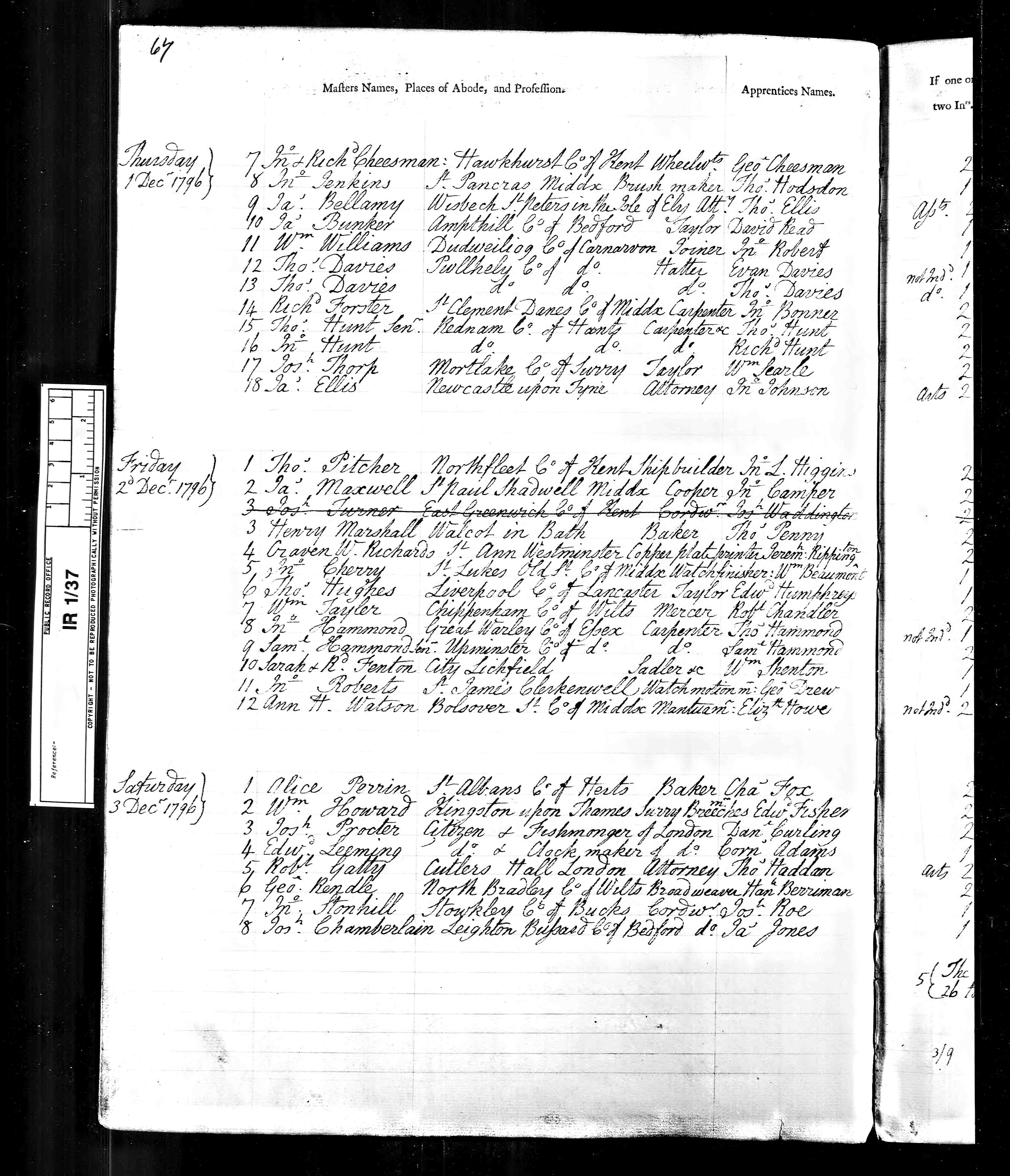 Occupation Apprentice Copper-plate Printer @ St. Ann, Westminster, Middlesex, London Rippington (Jeremiah) 1796 Apprentice Record |