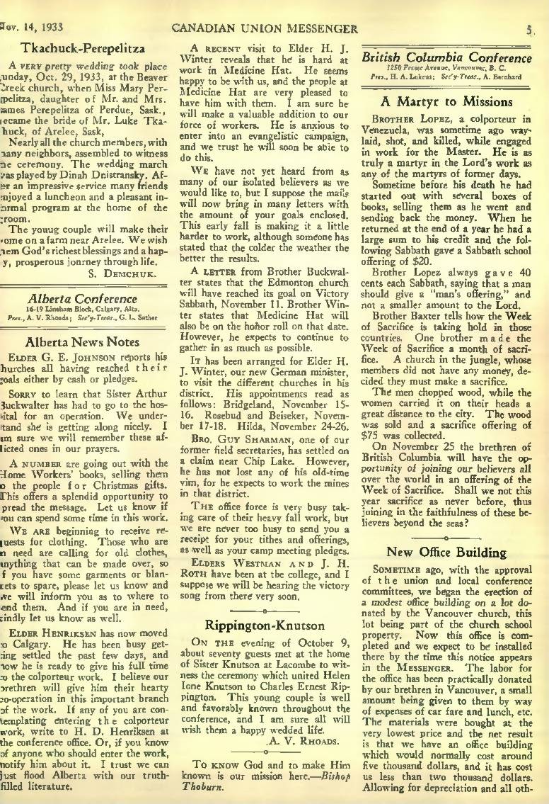 Married Charles Ernest RIPPINGTON in Lacombe, Alberta, Canada Nov. 14, 1933 CANADIAN UNION MESSENGER |