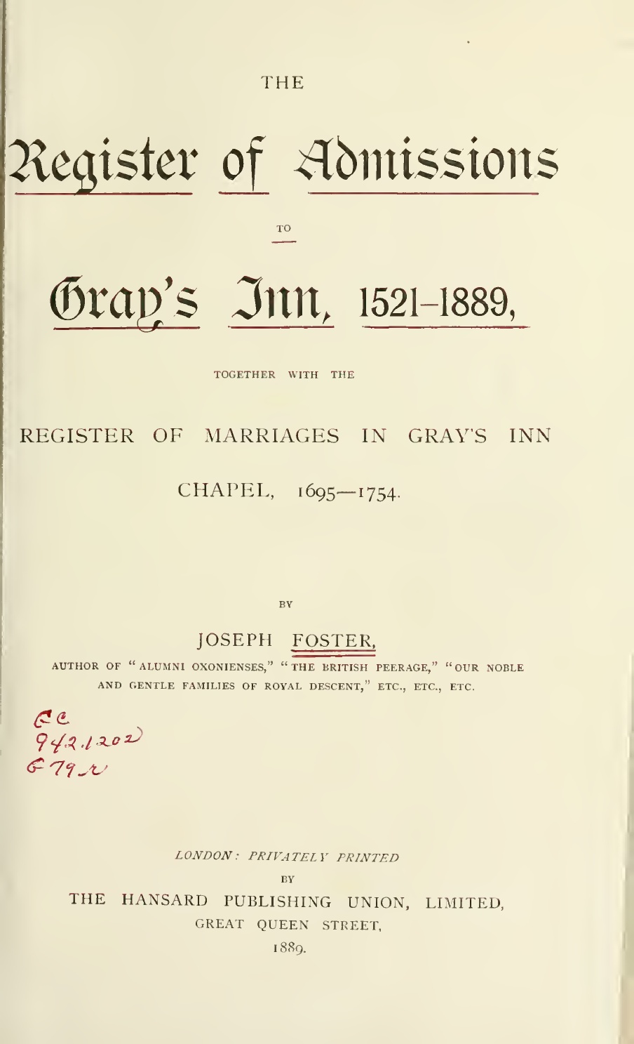 Grays Inn Admission Register 1521-1887 Frontispiece
