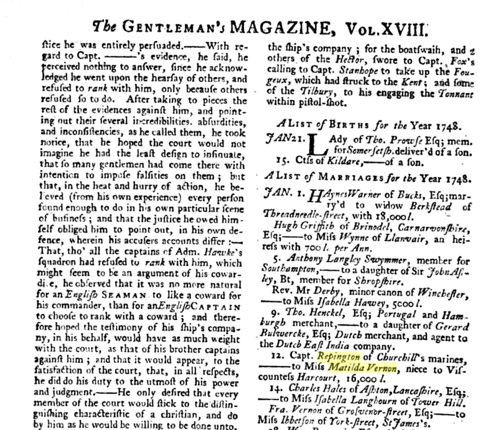 Married Captain Charles REPINGTON in St. Mary, Marylebone Road, Middlesex, London.1 Name: Charles Repington Esquire |