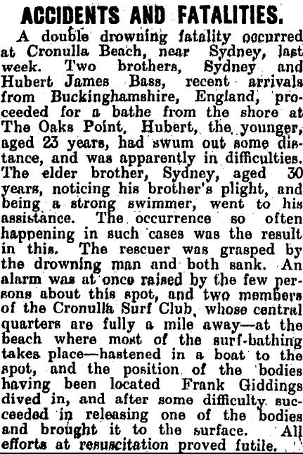 A double drowning fatality occurred at Cronulla Beach, near Sydney, last week. Two brothers, Sydney and Hubert James Bass, recent arrivals from Buckinghamshire, England, proceeded for a bathe from the shore at The Oaks Point. Hubert, the, younger, aged 23 years, had swum out some distance, and was apparently in difficulties. The elder brother, Sydney (sic), aged 30 years, noticing his brother's plight, and being a strong swimmer, went to his assistance. The occurrence so often happening in such cases was the result in this. The rescuer was grasped by the drowning man and both sank. An alarm was at once raised by the few persons about this spot, and two members of the Cronulla Surf Club, whose central quarters are fully a mile away at the beach where most of the surf-bathing takes, place hastened in a boat to the spot, and the position, of the bodies having been located Frank Giddings dived in, and after some difficulty, succeeded in releasing one of the bodies and brought it to the surface. All efforts at resuscitation proved futile."