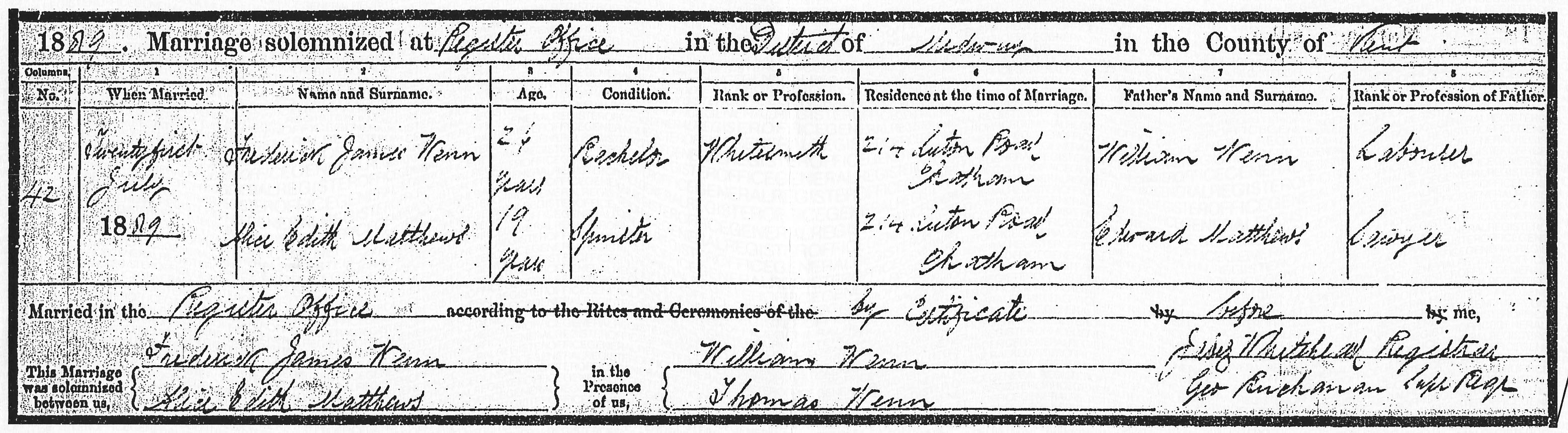 Frederick James Wenn & Alice Edith Matthews 1889 Marriage Certificate