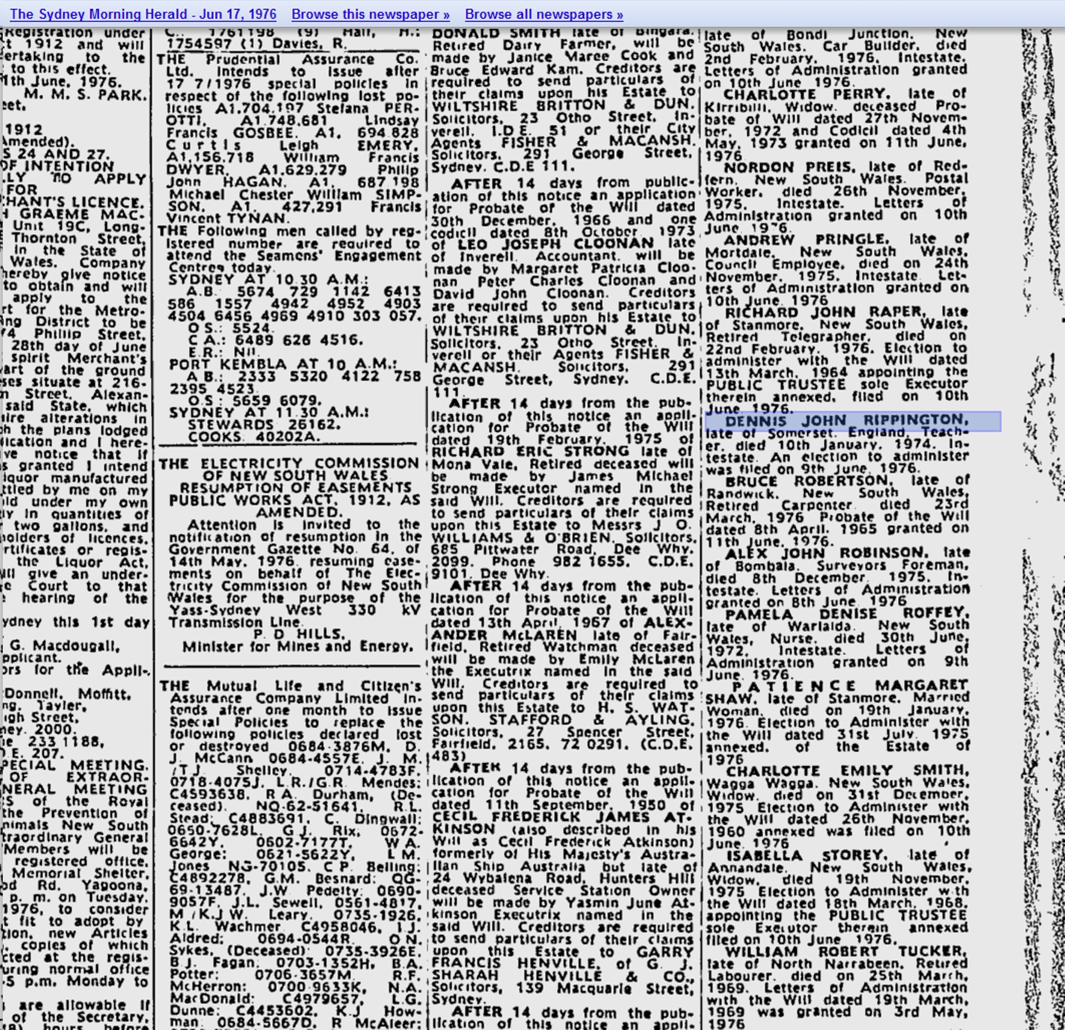 Wrote will in Administration Rippington (Dennis John) The Sydney Morning Herald Jun 17, 1976 |
