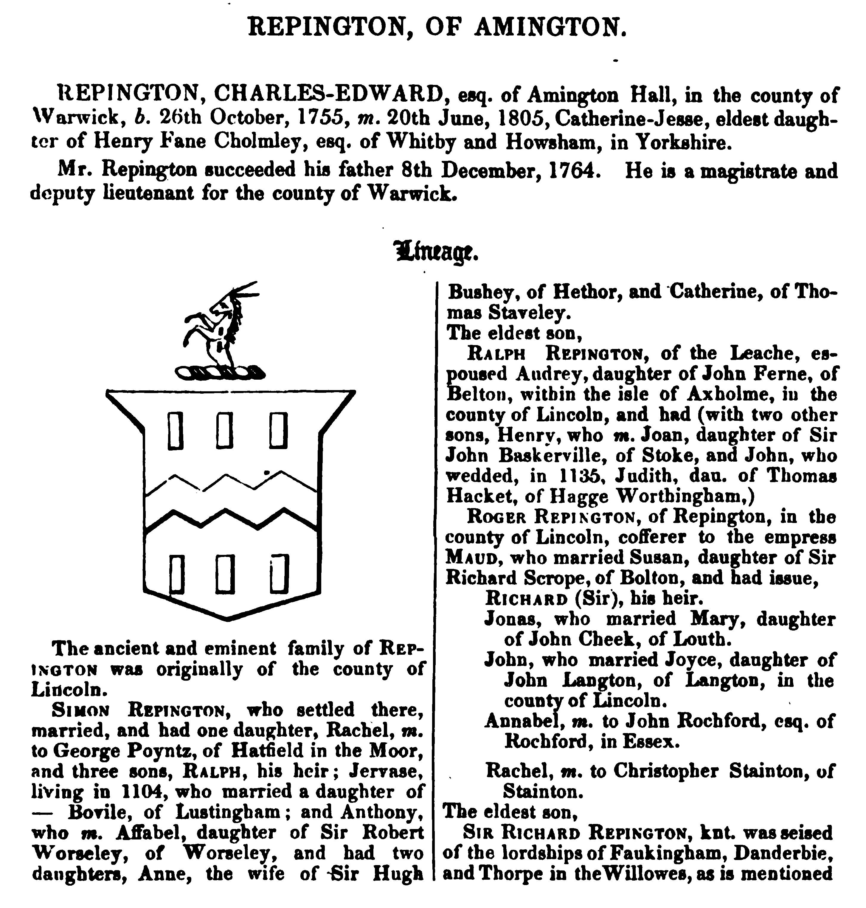 (click on the Repington Family Crest below for more details), historically owners of Amington