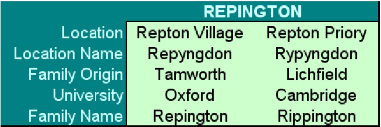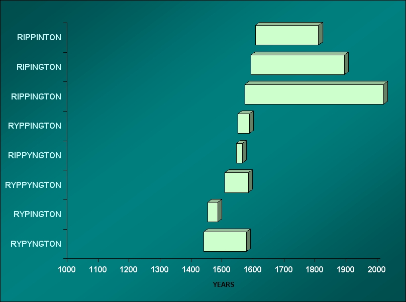 each surname from Repyngdon to Repington and Rypyngton to Rippington,