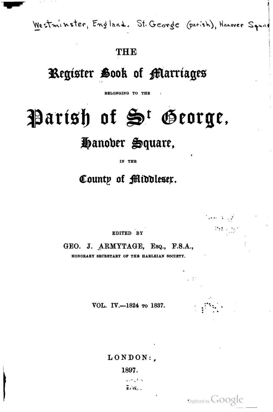 The register book of marriages of St. Georges Church, Hanover Square, Westminster, London Frontispiece
