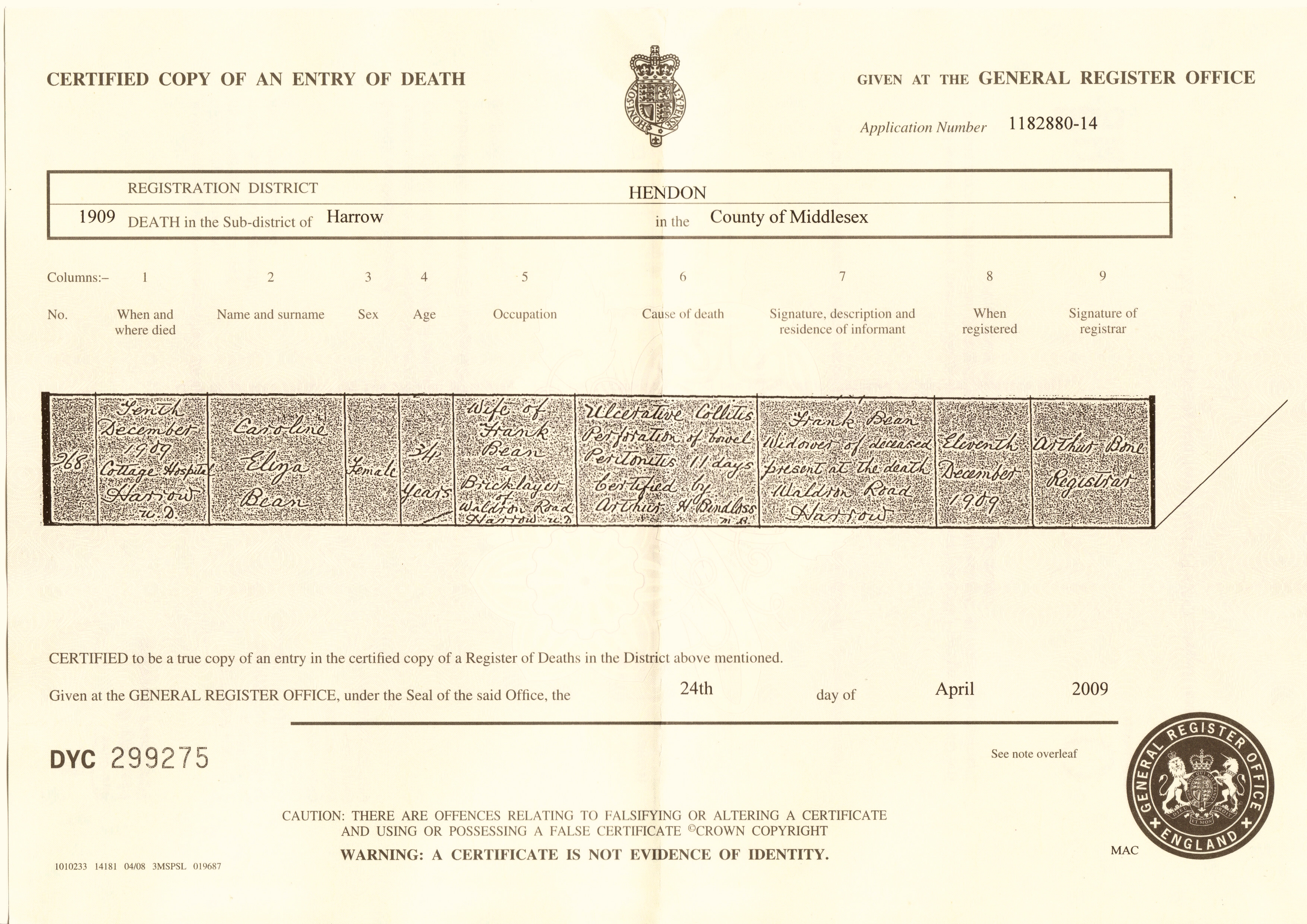 Bean (Caroline Eliza nee Myhill) 1909 Death Certificate