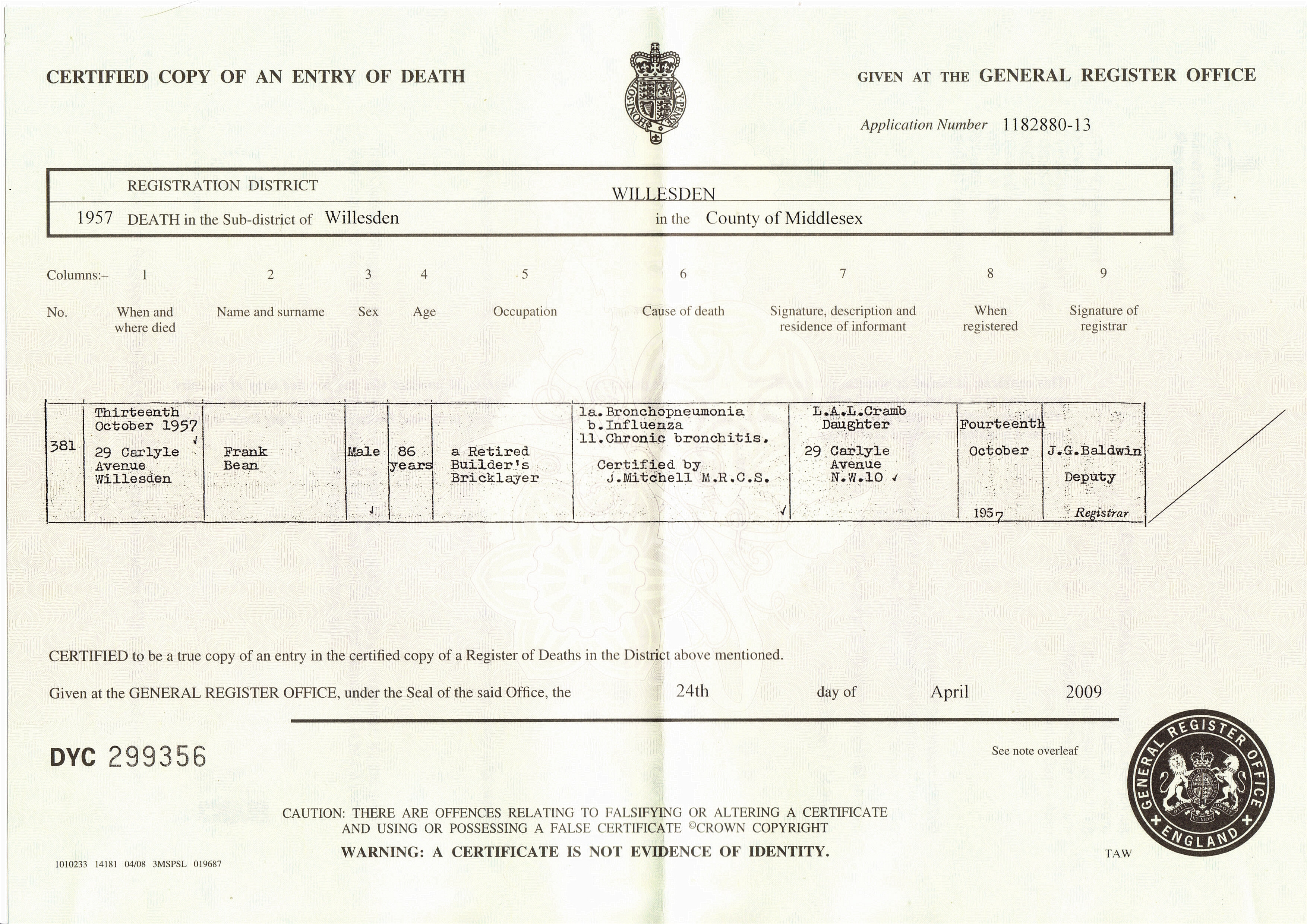Bean (Frank) 1957 Death Certificate