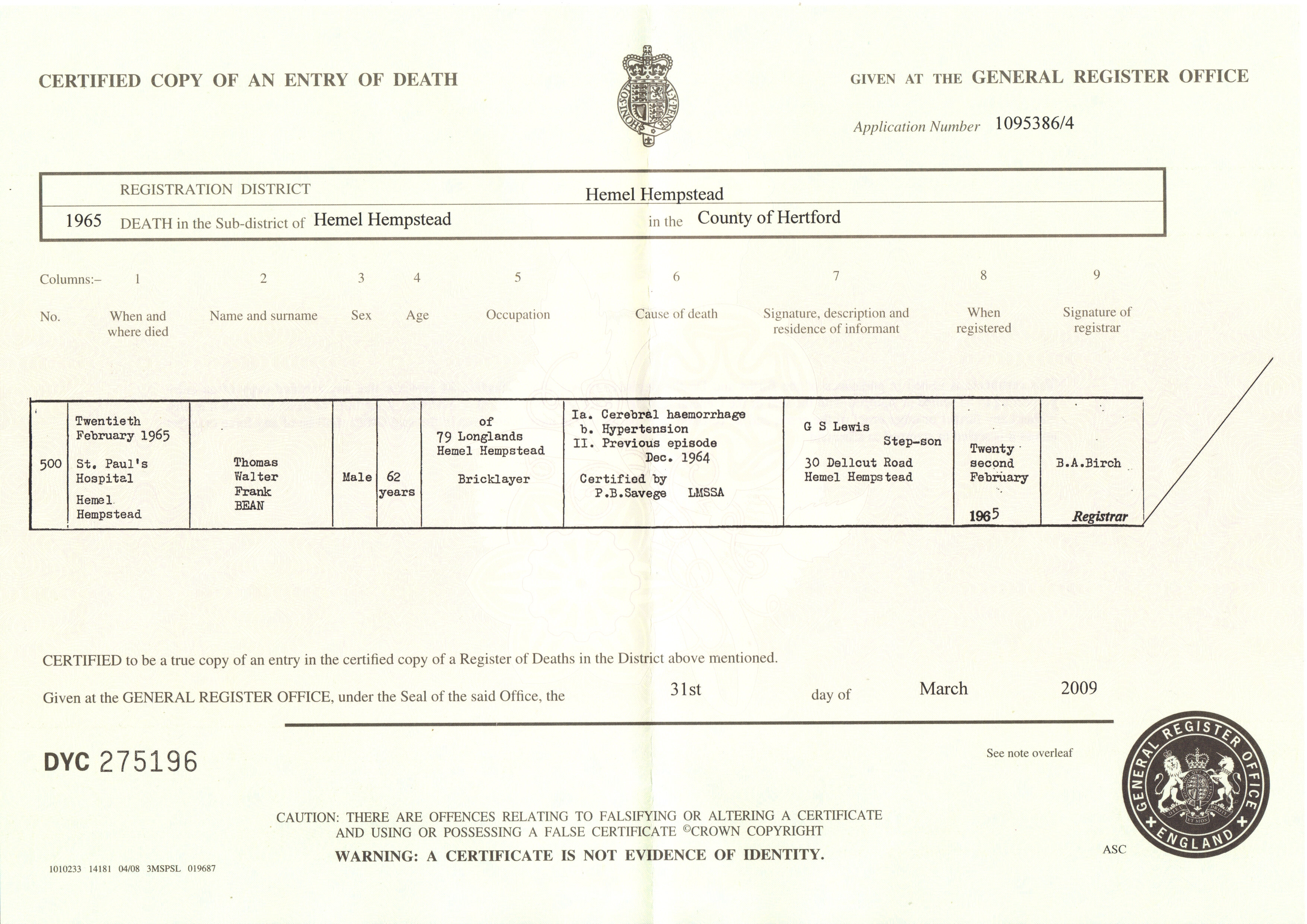 Bean (Thomas Walter Frank) 1965 Death Certificate