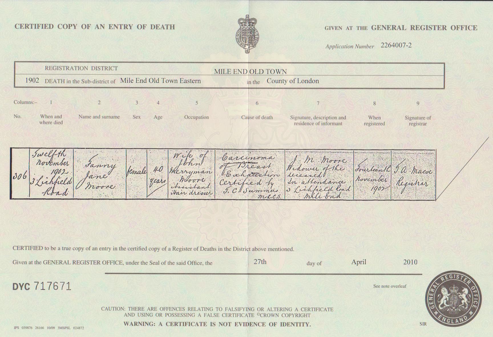 Moore (Fanny Jane nee Repington) Death Certificate