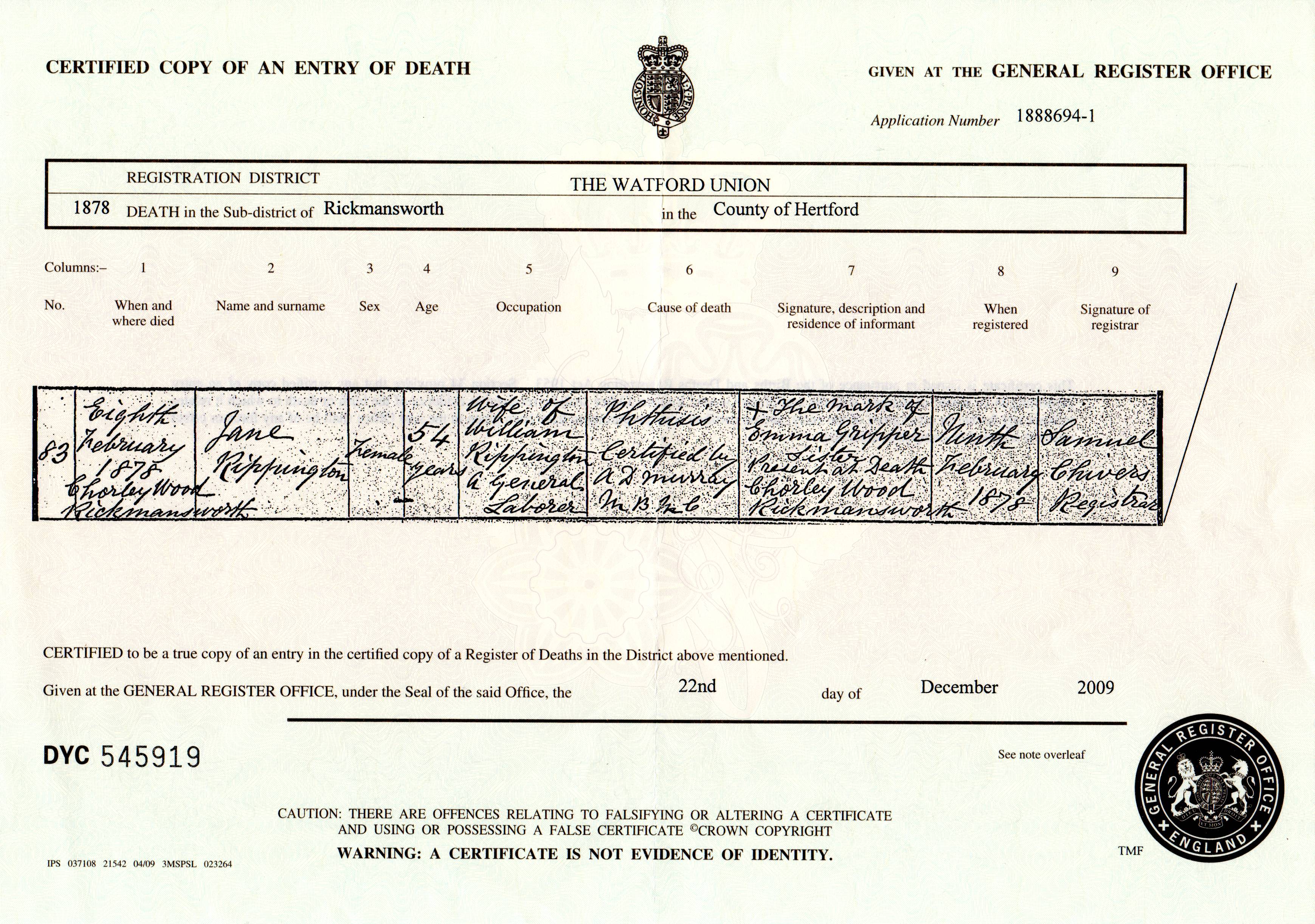 Rippington (Jane nee Woodstock) 1878 Death Certificate