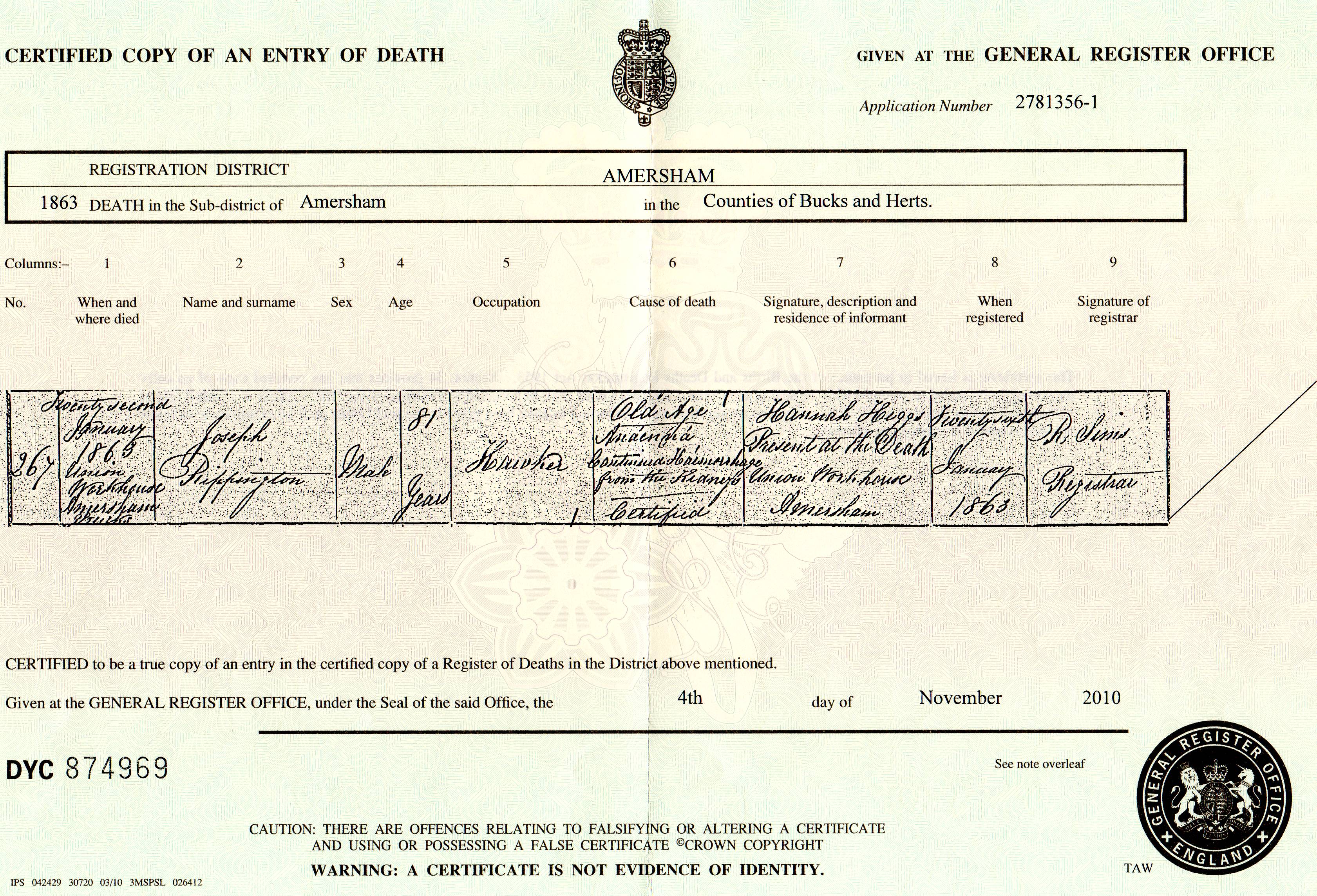 Rippington (Joseph) 1863 Death Certificate