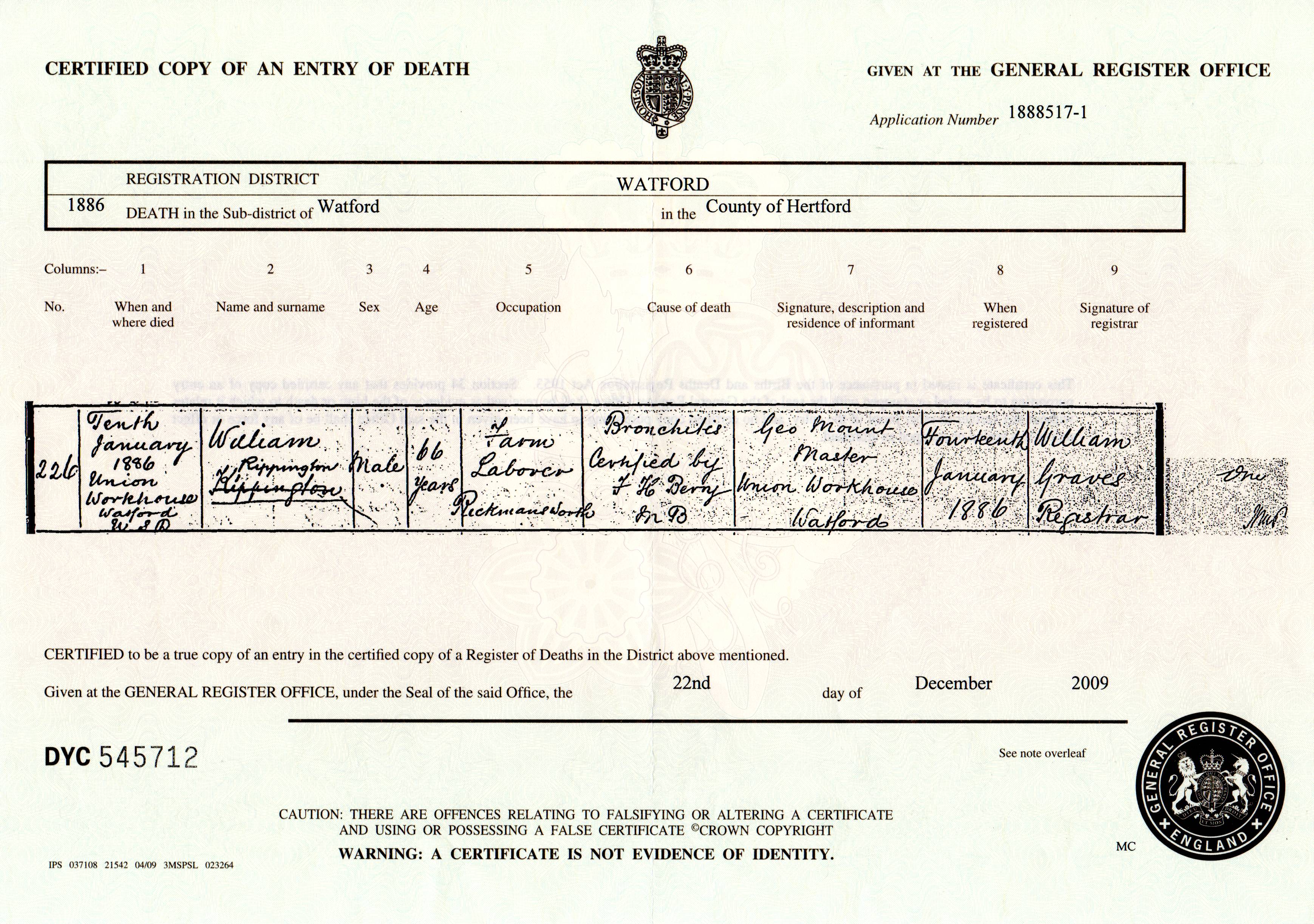 Rippington (William) 1886 Death Certificate