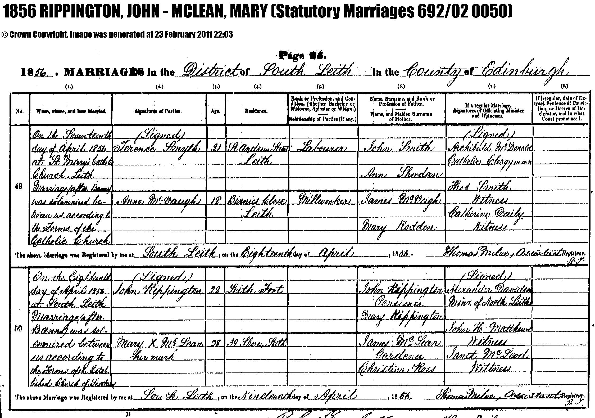 Rippington (John & Mary) 1856 Marriage Record